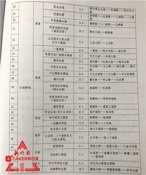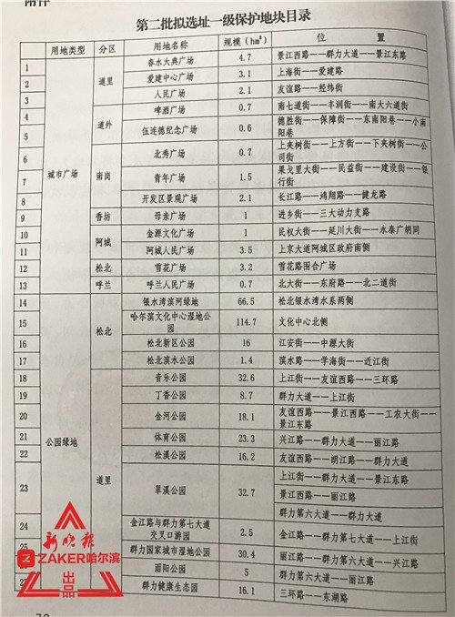 批准群力春水大典广场等 13 处城市广场、音乐公园等 37 处公园绿地,合计 50 处地块为第二批一级保护地块 , 由市政府向社会公布,实行挂牌保护。一级保护地块一经确定不得随意改变用途。