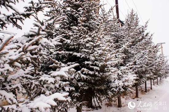 人民网哈尔滨11月14日电11月13日下午至11月14日,黑龙江省大兴安岭地区漠河县迎来新一轮降雪天气,部分地区积雪厚达10余厘米,降雪后的漠河县一片银装素裹,美不胜收,松树上挂满白雪,好似童话世界。