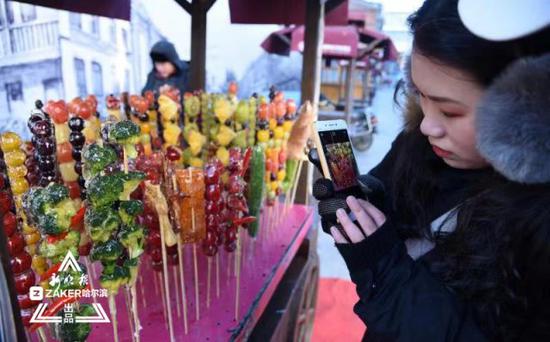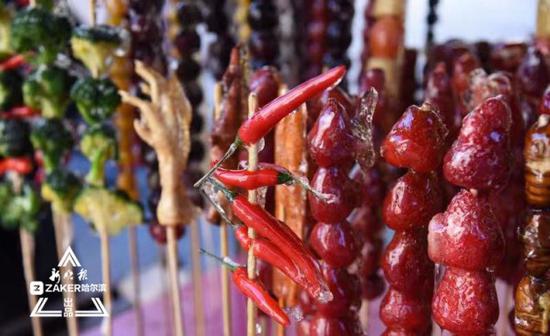只有想不到,没有做不到!10 日,在我市道外区百年巴洛克街区中, 一家糖葫芦摊摆出猪手、包子、鸡手、辣椒、苦瓜、辣条等造型各异的糖葫芦,加上山楂、小枣、草莓、葡萄等老式糖葫芦,一共有二十多样,口味一应俱全。