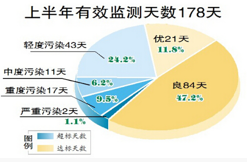 今年上半年,我市环境空气质量有效监测天数为178天,达标天数为105天,占有效监测天数的近60%,其中优21天,良84天。超标天数为73天,占40%,其中轻度污染43天,占24.2%;中度污染11天,占6.2%;重度污染17天,占9.5%;严重污染2天,占1.1%。超标天数中,以细颗粒物为首要污染物的天数最多,占80.8%,其次是可吸入颗粒物,臭氧、二氧化氮、二氧化硫。另据该局监测数据显示,今年上半年细颗粒物PM2.5、可吸入颗粒物PM10、二氧化氮、二氧化硫四项监测指标的半年均值分别为每立方米69微克、109微克、54微克、54微克,同比分别下降1微克、3微克、1微克、8微克,四项指标均呈下降趋势。
