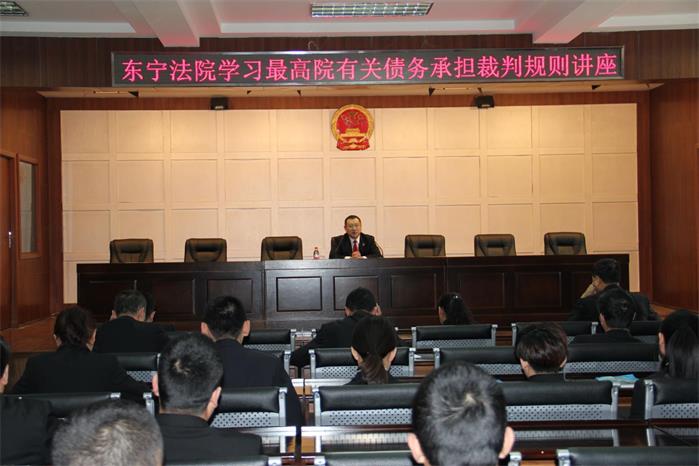 为进一步增强审判队伍素质,提高全院法官办案业务水平,东宁法院于4月15日针对最高人民法院有关债务承担裁判规则举办知识讲座,由副院长谢立明主讲,全院审判人员参加了培训。