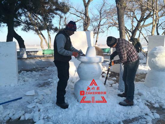 记者在斯大林公园里看到,大大小小的巨型雪块已经早早运抵公园。江堤上有、江面上也有,置身其中,仿佛进入童话世界。虽然大部分雪人还尚在建造中,但是从粗略雕成的外貌和身形,大概能猜出它们的样子。
