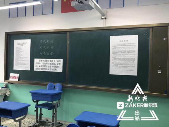 记者看到,考场门前统一张贴印有考场号和起止考号的考场门标。考场前方中间位置设考务桌。座位号从靠教室门第一座开始从小号到大号按竖蛇形四列排布,呈 “7887 式 ”,桌上统一粘贴桌签。桌面的污渍和字迹已被清洁干净,每扇窗都安上了遮阳光的窗帘,为考生提供了干净整洁的考试环境。考场前方黑板张贴《国家教育考试违规处理办法》(教育部第 33 号令摘要)和《考场规则》,粉笔书写的考试科目、考试时间、试卷页数。