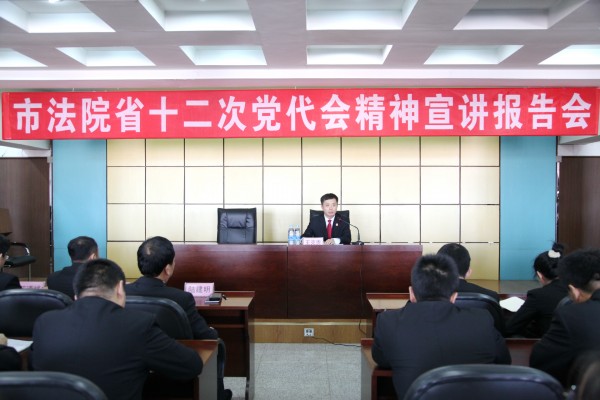 党组书记、院长王克贵为参会干警作了专题辅导,分别从第十二届党代会的意义、总结的成就经验、确定的主题、提出的崇高使命、部署的主要任务及强调的重点问题六个方面进行了深入分析和解读,并就结合实际抓好贯彻落实提出五点要求。王克贵指出,一要深入学习领会、提高思想认识。要在全市法院迅速掀起学习热潮,深入解读省党代会提出的重大理论观点、重大方针政策、重大工作部署,深入了解我市经济社会发展任务目标,深刻领会省党代会精神实质,把全市法院干警的思想和行动统一到省党代会精神上来。二要充分发挥审判职能作用,提高服务保障水平。要按照省党代会推进民主法治建设、营造良好发展环境的要求,紧紧围绕省市经济社会发展目标,全力抓好审判执行工作,为我市建设“活力边城、幸福家园”提供优质司法服务和有力司法保障。三要不断规范司法行为,提高司法工作标准。要结合落实司法改革有关要求,对岗位职责进行重新定位、对工作流程进行重新再造、对工作机制进行重新理顺,全面规范司法行为,不断提高司法标准和司法服务效果。四要努力加快工作节奏,提高法院工作效率。面对法院审判执行工作新局面和司法改革攻坚的紧迫形势,面对全面发展振兴的大好机遇和优化发展环境的要求,必须以时不我待的紧迫感、夙夜在公的责任感,抓住主要工作、抓住重点环节、抓住关键少数,以公正高效的司法服务,满足经济社会发展的司法需要。五要持续整顿纪律作风,提高队伍整体素质。要深入开展整顿纪律作风活动,坚决整治“冷横硬推”特权思想和衙门作风,坚决查处吃拿卡要损害群众利益问题。切实加强司法能力建设,不断提高干警政治业务素质,努力打造素质过硬、作风扎实、敢于担当的干部队伍。