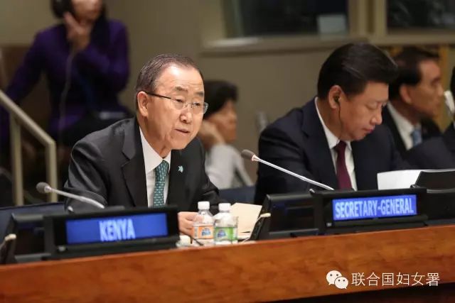 随后,联合国秘书长潘基文先生对本次大会致辞。潘基文秘书长表示,非常感谢中国政府参与组织全球妇女峰会,感谢习近平主席对妇女署工作的大力支持。他指出,本次峰会是对北京行动纲领落实情况的回顾。二十年来,尽管在两性平等很多领域有所进步,但是未来的道路还很长。性别歧视,对女性的暴力,非平等的受教育和就业机会,女性不能参与领导和决策,都是仍需解决的问题。没有妇女平等权益的完全实现,2030年的可持续发展议程就无法达成。潘基文先生呼吁各国领导人为实现全世界两性平等作出切实承诺,尽快解决同工不同酬等问题,实现妇女性和生殖健康的权益,终止对妇女和女童的暴力。为创建两性平等的社会环境,他倡导政府,公民社会和私人企业的共同参与。他说:“到2030年,我们需要一个性别平等的星球。让我们为性别平等再接再厉。”最后,他强调各国政府首脑为以下三方面作出行动:一,制定并落实可持续的两性平等政策;二,为两性平等注入资金;三,监督政策落实进程。