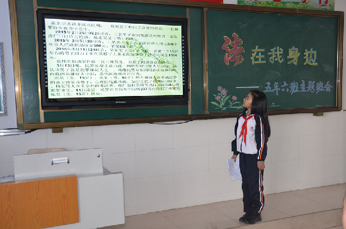 3月27日下午,九三农垦法院少年审判庭工作人员来到九三局直一小,参加了该校五年六班举办的“法在我身边”主题班会,班会先后采用电子图片讲解案例、同学们对《中华人民共和国未成年人保护法》和《中华人民共和国预防未成年人犯罪法》知识抢答以及法律知识多选和单选竞赛的形式进行,活动内容丰富,同学们参加的积极踊跃,达到了增强学生法律意识的目的,使小学生对自我维权,远离犯罪起到良好的教育引导作用。