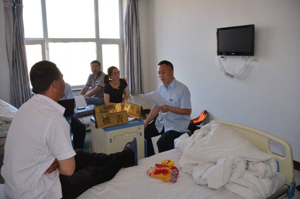 法官正在医院病房开庭审理一起民事侵权纠纷案件。