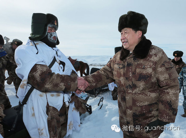 图2:2014年1月26日,习近平专程来到位于祖国边疆的内蒙古阿尔山,冒着零下30多度的严寒,顶风踏雪慰问在边防线上巡逻执勤的官兵。