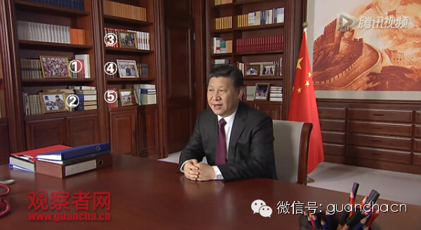 在他右手边的书架上,摆放了与去年不同的5张照片,经过观察者网小编的火眼金睛和仔细搜索终于找到了这5张照片,其中两张跟军队有关,两张是关于儿童的,还有一张是关于扶贫的。到底是哪几张,快点来看看(如下图所示1~5顺序)。