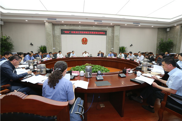 最高人民法院审判委员会专职委员、第二巡回法庭庭长胡云腾率联合督察组在黑龙江高院审委会会议室召开司法改革工作座谈会。陈凡 摄