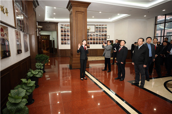 李显刚一行先后参观了院史馆、图书馆等法院文化设施,视察了省法院执行指挥中心、诉讼服务中心,观看了信息化建设和司法责任制改革专题片,听取了法院在信息化建设、司法改革、诉讼服务等方面工作的介绍。