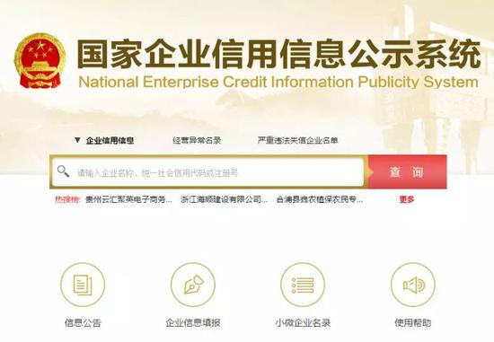 国家企业信用信息公示系统( 网址:www.gsxt.gov.cn )于2017年底全面建成使用,是覆盖全国的唯一企业信用信息政府网站,集中归集、记载、公示了全国企业信用信息。消费者、企业、社会组织等可直接通过该网站,用企业名称进行精准或者模糊查询,即可轻松获得全国任何一户企业的有关信用信息,包括营业执照、许可证、业务资质、注册商标、法定代表人、企业高管、年度报告等信息和投资人、投资额、资产状况、经营状况、用工、社保、网站网址等信息,以及行政处罚、经营异常名录、“黑名单”、是否被吊销证照等信息。消费者、企业、社会组织等可直接登录该网站。
