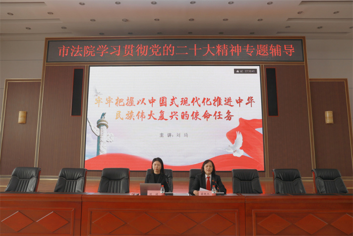 为深入贯彻落实党的二十大精神,切实把党员干部的思想和行动统一到会议精神上来,按照市直机关工委的安排部署,4月7日下午,伊春市中级人民法院举办学习贯彻党的二十大精神专题辅导,邀请伊春市委党校副教育长、科研决策部主任、副教授刘琦为干警作题为《牢牢把握以中国式现代化推进中华民族伟大复兴的使命任务》的专题讲座。