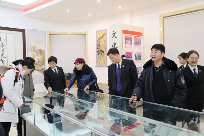 为表达对工作组远道而来的欢迎,同时加深工作组对伊春中院的了解,引导员带领工作组成员细致地参观了伊春中院的各个功能场所。来到诉讼服务中心,在单玉波的热情邀请下,工作组成员纷纷拿出手机扫码关注伊春中院官方公众号平台。当走进文化建设厅时,一副由最高法院咨询委员会、原广西高院院长罗殿龙为伊春中院亲笔题的字,让大家感叹缘分的奇妙,展示柜中陈设的许多历史感厚重的办公用品同样勾起了法院同仁满满的回忆。