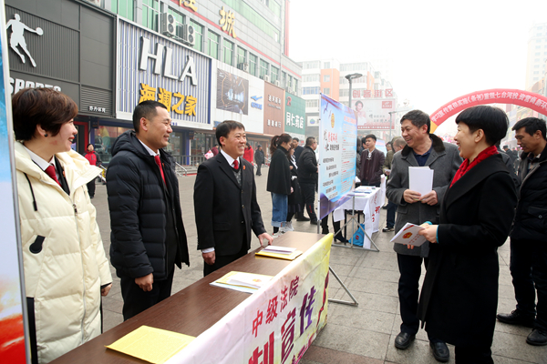 活动中,七台河中院党组成员、政治部主任李作玉带领5名一线干警,通过发放宣传单、宣传手册、设置宣传台及宣传展板的方式为百姓答疑释惑。