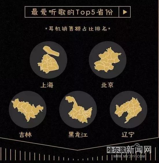 统计显示,上海、北京、吉林、黑龙江、辽宁是最爱听歌的Top5省份,这五个地方的耳机销售额占比在全国范围内排名前五。