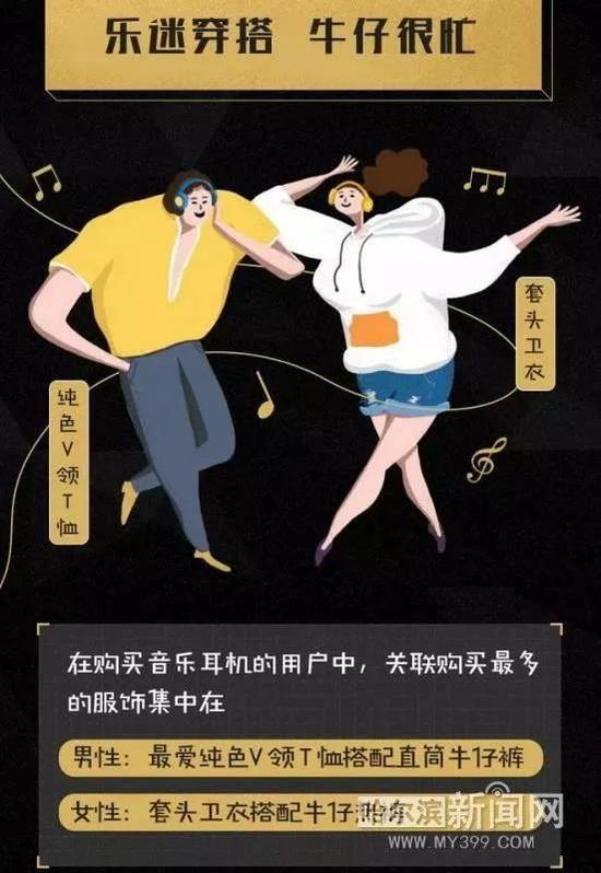 据了解,在购买音乐耳机的用户中,关联购物最多的服饰集中在:男性为最爱纯色V领T恤搭配直筒牛仔裤;女性为套头卫衣搭配牛仔热裤。