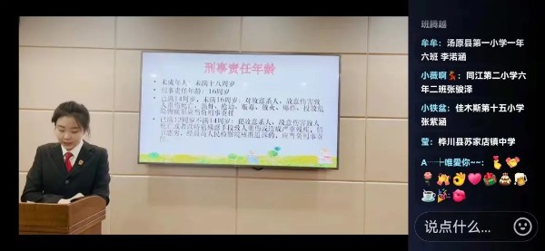 晚上七点三十分,由佳木斯中院少年审判庭员额法官张译冉主讲的“开学法治第一课”在“佳木斯便民资讯”抖音号准时开播。课上,授课法官以保护“少年的你”为主题,结合《中华人民共和国未成年人保护法》《中华人民共和国预防未成年人犯罪法》、预防校园欺凌相关知识,教育引导学生从小养成尊法崇法、守法用法意识,树立人生志向,勤奋学习,拥抱正能量。互动中,家长师生纷纷留言表示在这堂法治课中受益匪浅。直播过程中,随着课程的推进,峰值观看人数达到2.3万人次。