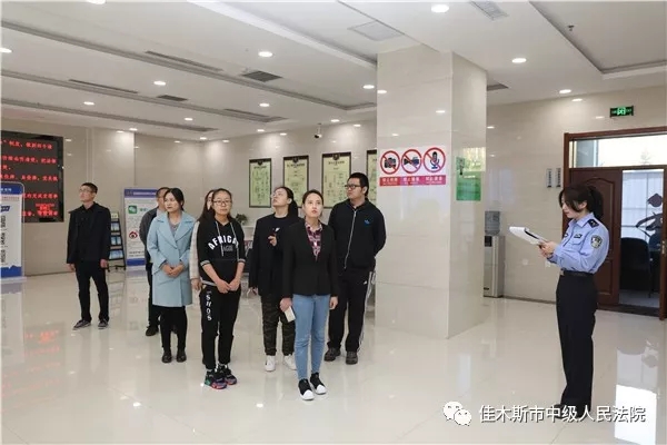 在讲解员的引导下,新同志们依次参观了佳木斯中院法警备勤室、警务监控中心、诉讼服务中心、法院安检通道、刑事审判法庭、少年审判法庭、执行指挥中心等办公场所。