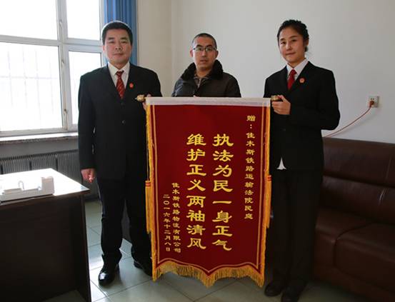 近日,佳木斯铁路物流有限公司领导走进佳木斯铁路运输法院,送来了写有“执法为民一身正气、维护正义两袖清风” 的锦旗,表达对该院民庭的感谢。