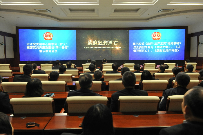 10月23日下午,哈尔滨市中级人民法院在信息化集控中心召开党组中心组学习(扩大)暨落实党风廉政建设“两个责任”警示教育会议。市法院院领导,各部门正职、廉政监察员、副职参加会议,并在会上集中观看了《践行“三严三实”的好榜样》、《贪欲之害》、《从疯狂到灭亡》、《腐败官员忏悔录》等正反典型专题片。
