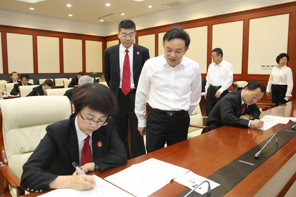 继去年全省首批12个试点法院完成法官入额遴选工作后,今年8月份,全省法院全面推开法官入额遴选工作。9月3日上午9时,全省法官入额遴选笔试在省内各市县区设置的60个考点同时开考,来自全省各级法院的4893名法官通过自愿报名、岗位承诺、资格审查等有关程序后参加了本次考试。省委常委甘荣坤,省法院党组书记、院长石时态,省法官、检察官遴选委员会主任委员薄宏奎巡视了部分考点。