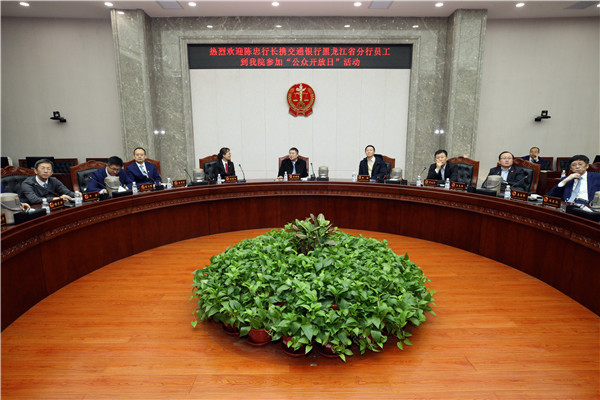 11月28日上午,省人大代表、交通银行黑龙江省分行党组书记、行长陈忠带领分行20余名员工走进省法院,近距离感受开放、动态、透明、便捷的阳光司法新机制。省法院副院长李华菊陪同参观。