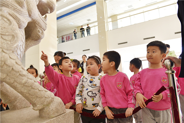 小朋友们在法院工作人员的引领下,参观了审判大楼、科技法庭,并观看了幼儿法制教育短片《不要拉我去打架》,感受法律的威严与神圣,在幼小的心中播下法治的种子。为了让小朋友们更容易、直观地了解法院工作,参观过程中,讲解员以通俗易懂的语言向小朋友们介绍法院审判执行等各项工作,让小朋友们通过“听故事”、亲手触摸古代法治象征獬豸、跟随讲解员朗诵宪法宣誓誓词等方式,进一步感受法律的神圣和庄严。