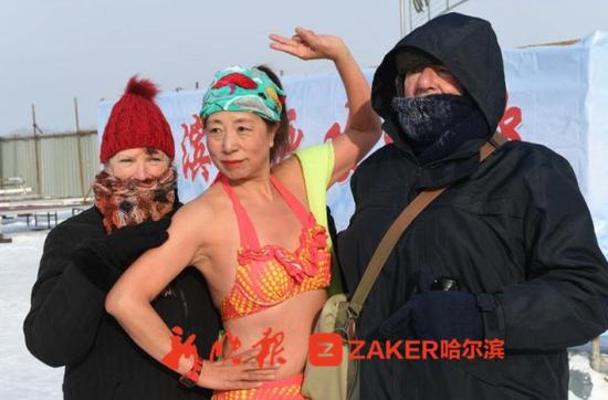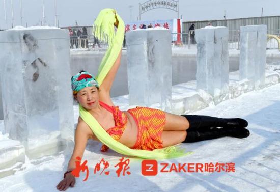 她早已把冬泳池四周当成了她的 T 台秀场,对向自己投来的惊异目光的人,她会主动与之握手,用微笑和礼貎的问侯回敬。看到外国友人她还用英语或俄语向他们问好。在她的带动下,冬泳场沸腾了,游客争相与她一起互动、拍照、欢呼,甚至有游客为了跟她贴身拍照偷溜进内场。她一会儿坐在冬泳池旁的冰墩上,一会爬到江面的雪堆上让游客尽情地拍照。爬冰卧雪,一拍就是半个多小时!