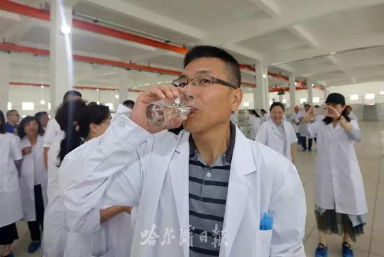 7月5日9时50分,在哈尔滨新区净水厂,76岁的关荣芝用透明的水杯接了一杯 “出厂水” ,细细品尝起来。