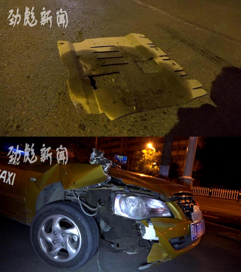 哈尔滨出租车撞坏一溜隔离带 车体受损严重