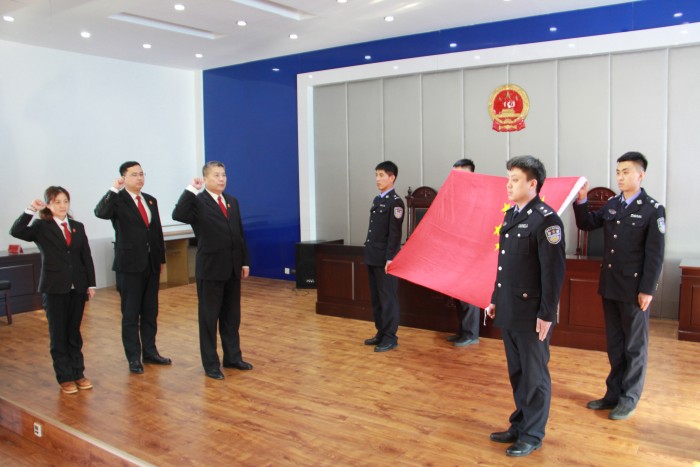 “我宣誓:忠于中华人民共和国宪法……为建设富强、民主、文明、和谐的社会主义国家努力奋斗!”2月11日上午,齐齐哈尔市建华区人民法院三名新任职同志面向国旗庄严宣誓。