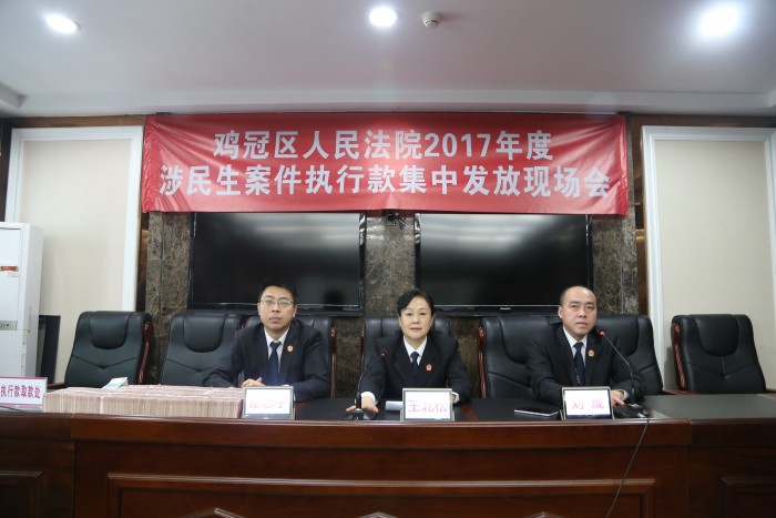 1月16日,鸡西市鸡冠区法院召开第三次涉民生案件执行款现场发放会,当场兑付案款100万元。在为期三个月的涉民生案件执行专项活动中,鸡冠区法院已现场发放涉民生案款310万元,使当事人的合法权益及时得到兑现。