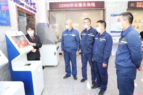 为推进司法公开,让群众参与、监督、见证法院扎实开展队伍教育整顿,5月13日,中国石油双鸭山销售分公司福利油库职工走进双鸭山中院,参加第105次“公众开放日”活动,体验网上立案和智能服务终端,了解法院队伍教育整顿工作。