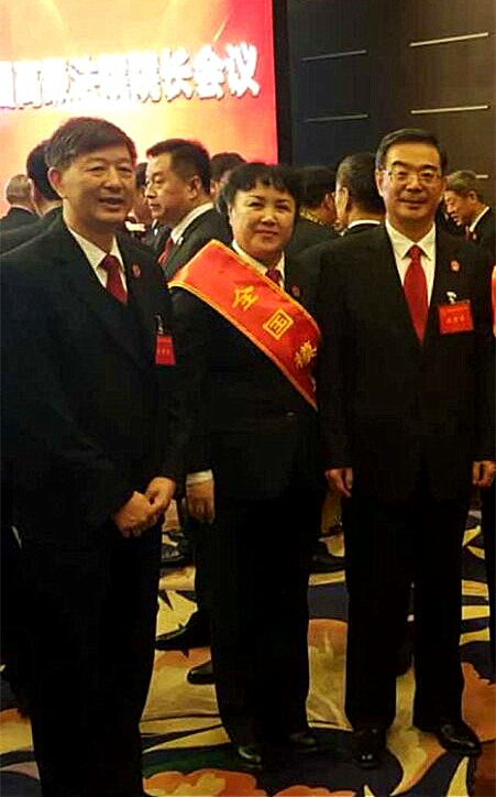 最高人民法院院长周强、上海市高级人民法院院长崔亚东与绥化市北林区法院执行局局长伊淑娟合影。