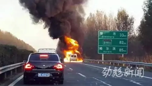 劲彪新闻10月3日讯(记者 肖劲彪)今天17时05分左右,在哈大高速公路由安达往哈尔滨方向(距离)肇东33公里处一辆依维柯客车发生自燃,虽然消防官兵及时赶到现场将火扑灭,但大火还是将整个车体烧成了空壳。