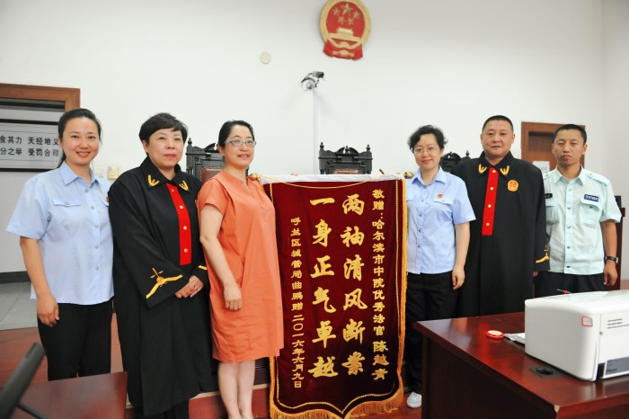 6月30日,一起离婚案件的被上诉人曲某和其代理人张丽娟律师将一面“两袖清风断案、一身正气卓越”的锦旗送到了哈尔滨中院机关党委,同时激动地说:“感谢法官的耐心调解,感谢人民法院的公正处理!”