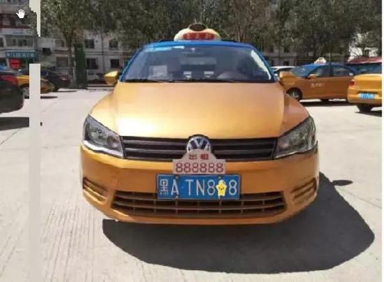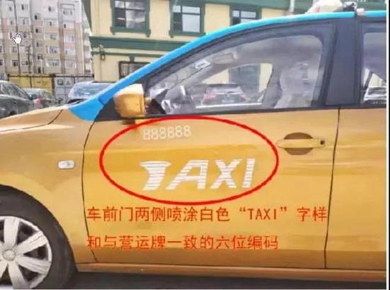 车前门两侧喷涂白色“TAXI”字样和与营运牌一致的六位编码
