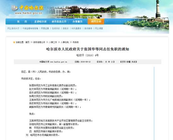 哈尔滨市人民政府关于张国华等同志任免职通知