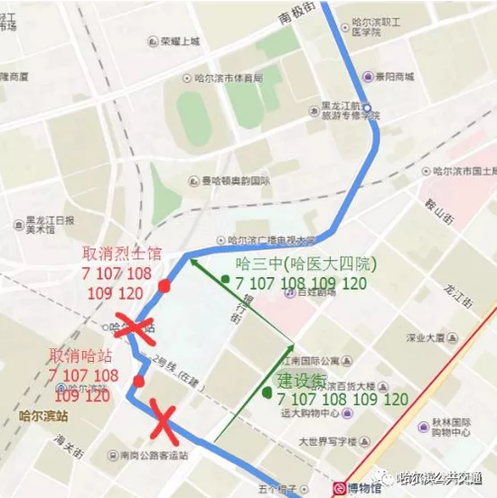 临时取消哈站站、烈士馆站;临时增设建设街站、哈三中(哈医大四院)站。