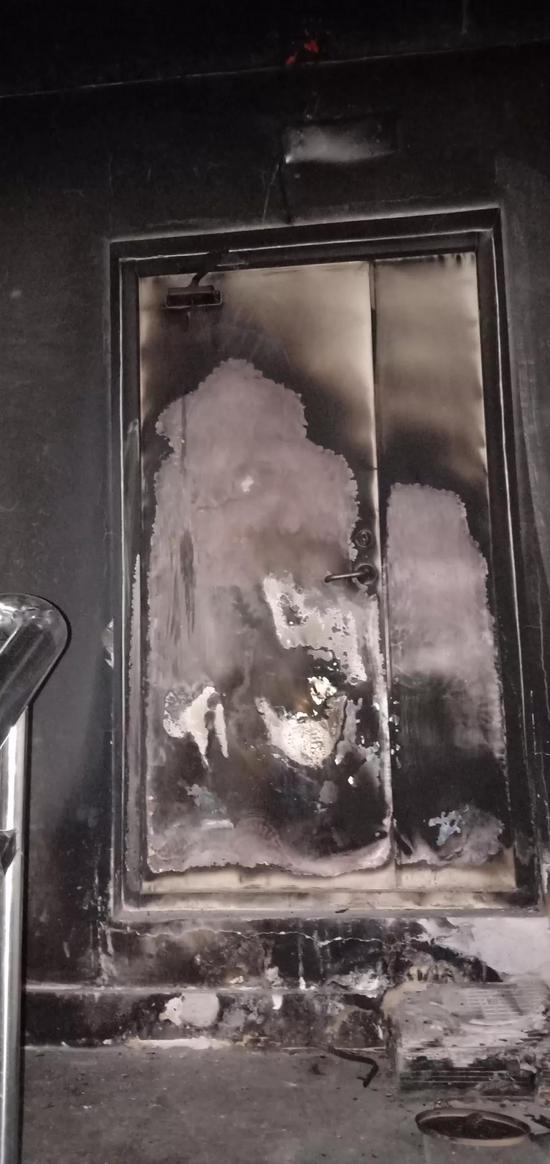 ▲17楼消防通道被烧焦记者在17楼和22楼都看到,通往消防连廊的消防门都因过火而发生不同程度的变形和损坏,消防门上的指示牌及棚灯也被卸掉,电线裸露在外面,地砖上也有烧焦的痕迹。