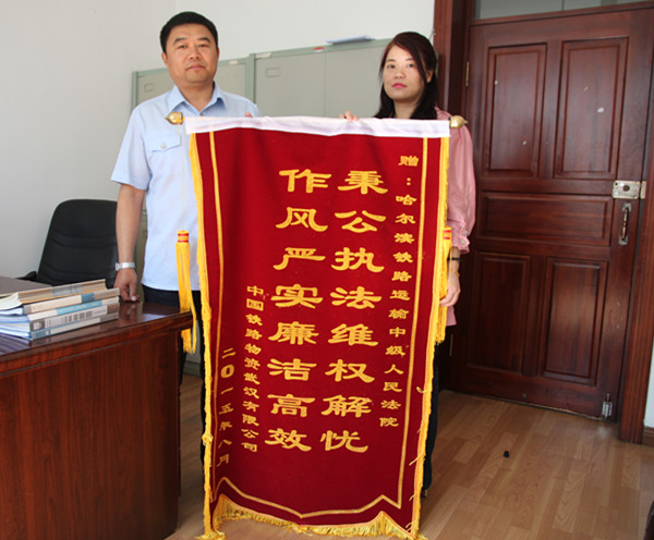 9月10日,中国铁路物资武汉有限公司(以下简称中铁物资武汉公司)派专人从武汉来到哈铁中院,赠送写有“秉公执法维权解忧,作风严实廉洁高效”的锦旗,对哈铁中院坚持公正办案,积极为企业发展提供司法保障表示感谢。