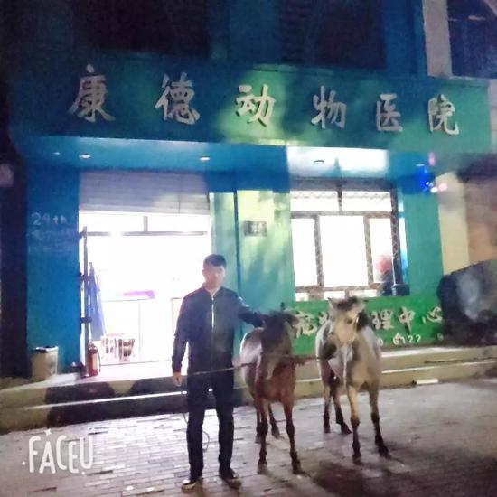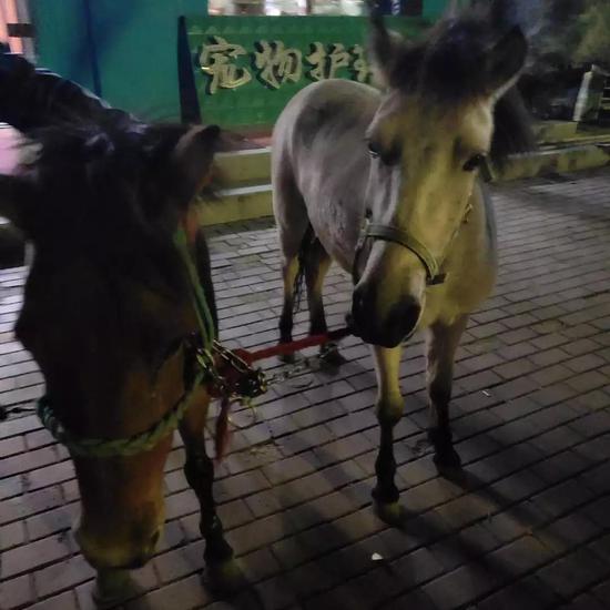 康德动物宠物医院医生李德宁介绍说他观察了好一会儿,一直没看到马主人。因为担心发生意外,决定将它俩牵回医院。当时两匹马已明显受惊,费了老大劲,在大家的帮助下才把马抓住。