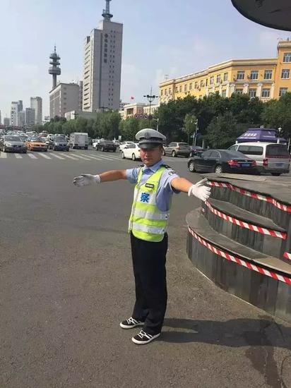 14时,穿上蓝色的警服短袖、金黄色反光马夹,戴上警帽,经过哈市交警动力大队一中队民警陈吉升的交通指挥手势训练后,记者便走上省政府岗上,正式开始指挥交通。