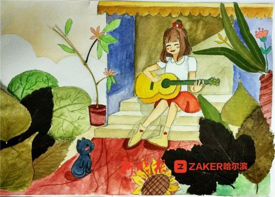 大二中医专业的曾雨薇同学用树叶画了一幅漫画,想传达悠然自得的心境。