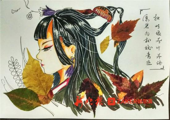 大三学生冯烨芸获得了一等奖,她的作品以彩铅和马克笔上色,树叶胶粘,人物均为脑中意象,信笔而作。