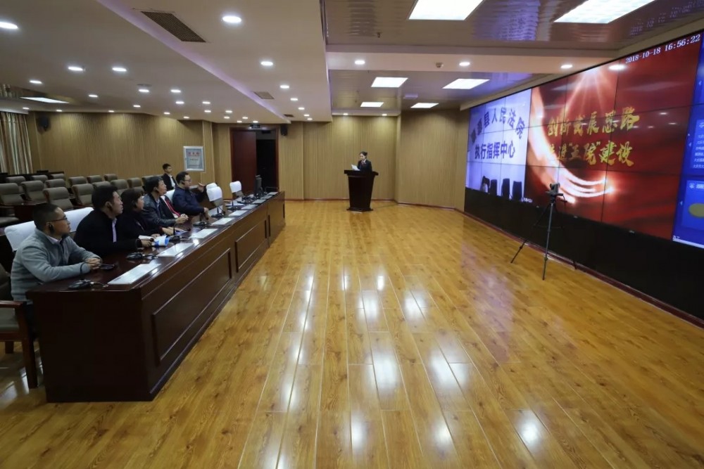 在执行指挥中心,执行干警为参观人员进行现场演示。通过执行指挥系统视频连线基层法院多个执行现场,分别通过单兵发布指令,及时进行工作布置,使参观人员直观感受到科技与执行工作的深度融合。