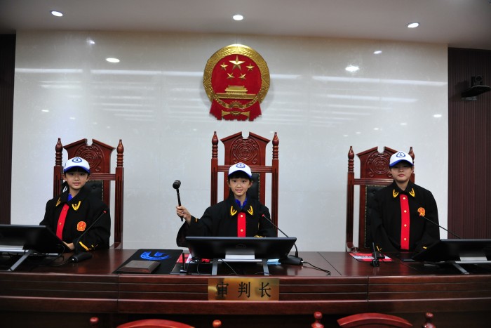小记者们在讲解员的引领下在诉讼服务中心了解立案流程,在阳光大厅感受法院文化,在图书馆认真翻阅法律类书籍,在科技法庭穿上法袍体验模拟庭审……