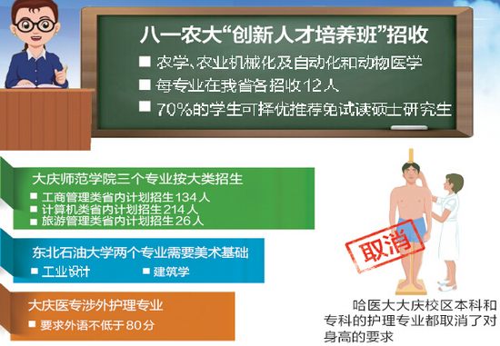 记者采访时了解到,今年,黑龙江八一农垦大学新增3个专业,大庆师范学院新增2个专业,哈医大大庆校区取消了护理学对身高的要求,东北石油大学、大庆医学高等专科学校也对个别专业提出了要求。