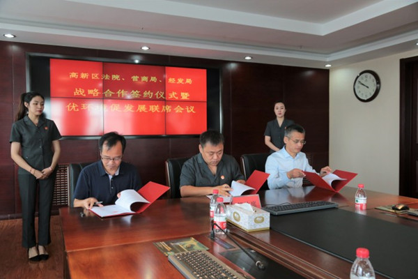 近日,高新区法院与高新区营商局、高新区经发局在高新区法院诉调对接中心举行“高新产业调解室”揭牌仪式。随后,三方共同召开了“优环境、促发展”联席会议,共同签署了《战略合作协议》。